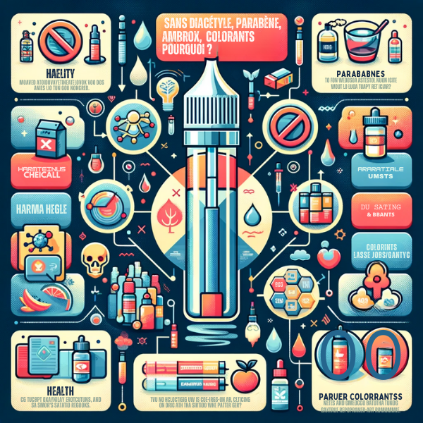 Opter pour des e-liquides sans diacétyle, parabènes, ambrox et colorants présente des avantages significatifs. Tout d'abord, cela réduit les risques potentiels pour la santé pulmonaire et générale. Les utilisateurs peuvent vapoter avec une plus grande tranquillité d'esprit, sachant que leur e-liquide est exempt de ces substances controversées. De plus, cela encourage les fabricants à privilégier la qualité et la sécurité dans la production d'e-liquides, menant à des innovations et des formulations plus saines. Enfin, cela reflète une prise de conscience et une responsabilité croissantes dans la communauté de vapotage, favorisant des pratiques plus sûres et plus durables.